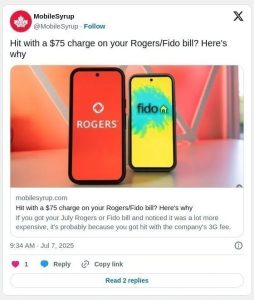 Rogers上個月宣布了這項新收費,公司表示,將向使用3G(或更老版本)網絡的客戶收取一次性75加元的費用,涵蓋整個計費周期。