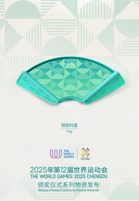 颁奖托盘整体为圆润流畅的扇形,握柄处浮雕太阳神鸟振翅与芙蓉盛放图,再现古蜀金沙文明与“蓉城”千年花事。托盘采用蓝绿渐变釉色,如青城叠翠;内衬防滑绒布印世运几何纹,沿袭大运会模具的梯形握柄兼顾防滑与人体工学。