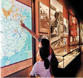 圖:在主題展覽現場,一位家長對照地圖向孩子講解抗戰歷史。