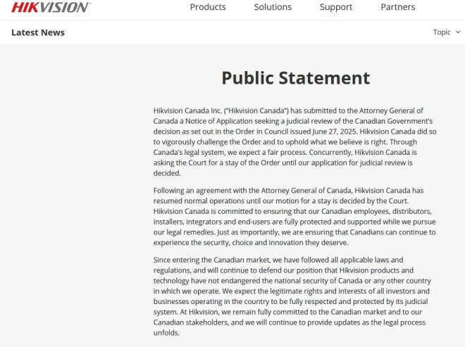 海康威视在声明中表示,该公司自进入加拿大市场以来,遵守所有适用的法律和法规,公司将继续捍卫其立场,即海康威视的产品和技术没有危及加拿大或公司运营所在的任何其他国家的国家安全。