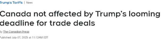 加拿大未被包含在那些全球关税之内,并已承诺在7月21日前与美国达成某种形式的双边协议。
