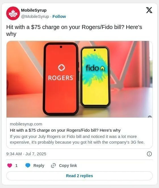 罗杰斯还表示,已向可能被收取费用的客户发出通知,该费用将于2025年6月30日出现在仍使用3G网络的客户的账单上。
