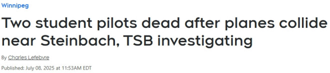 当地一家飞行学校证实,周二上午,在曼尼托巴省的Steinbach附近,两架飞机发生空中相撞,导致两名飞行员死亡。