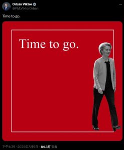 當地時間7月9日,匈牙利總理歐爾班在社交媒體X平台發文,並配了張馮德萊恩走出紅色框架的圖片。