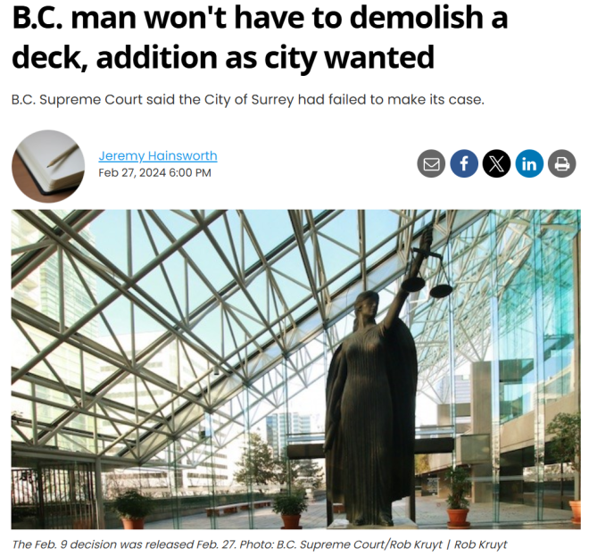 据Vancouver Is Awesome的报道,BC省最高法院于2024年2月9日裁定素里一名业主无需按照市政府要求,拆除房屋后方的露台和附加结构。