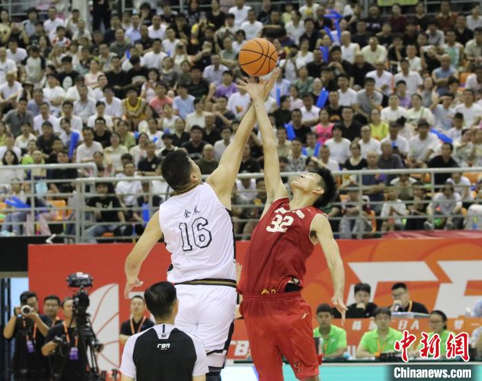 7月9日晚,株洲“厂BA”明星队对战华侨大学男篮。图为比赛开球。 周阳 摄