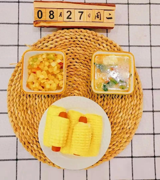 2024年8月,褐石培心幼儿园晚餐中提供的玉米卷肠包。图/受访者提供