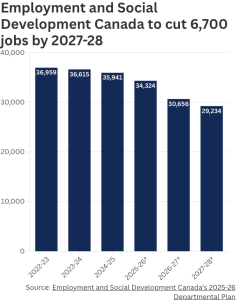 該報告概述了加拿大就業部ESDC的計劃,預計該部門的員工人數將從2025年3月的35,941人減少到2027-28年的29,234人,相當於損失6,707個全職職位,降幅略高於18%。