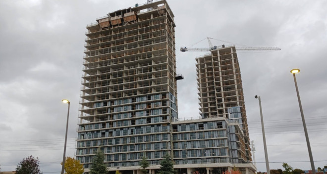 据Altus Group的数据,在安省其他地区,如基奇纳-滑铁卢和汉密尔顿,截至3月份的半年内,年化楼花公寓销量比2020年至2024年的年均水平低了约80%。