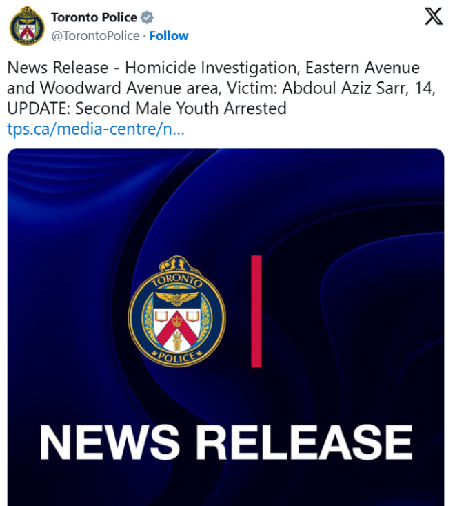 受害者:14岁的 Abdoul Aziz Sarr,不治身亡,成为多伦多2025年第19宗凶杀案受害者