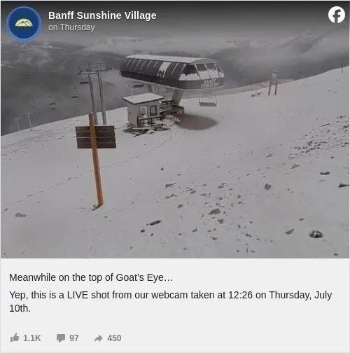 滑雪场在其Facebook 页面上发布道:“与此同时,在山羊之眼山顶上……是的,这是我们的网络摄像头在 7 月 10 日星期四 12:26 拍摄的现场画面”。