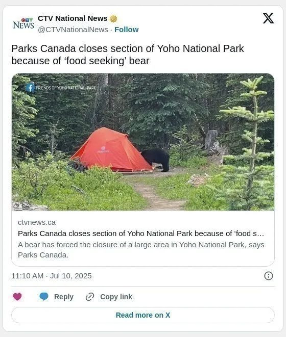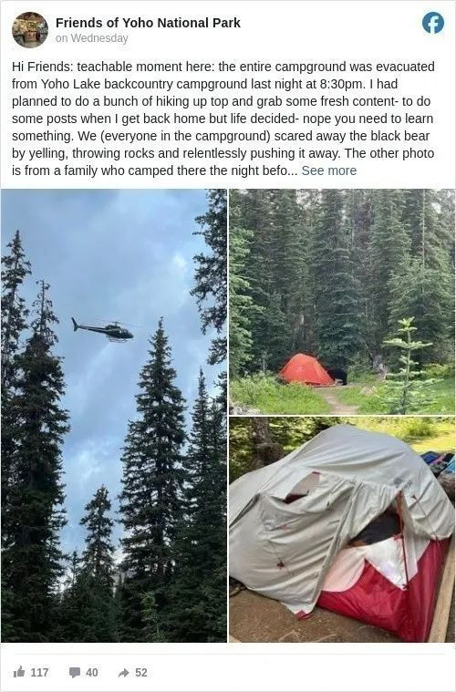 就在本周一,公园管理局就优霍国家公园(Yoho National Park)的黑熊活动向另一个营地发出警告,同时疏散了一个营地。