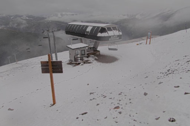 不过,雪很薄,因此很快就化掉了。到了下午,只剩下滑雪缆车阴凉处的一小块积雪和缆车顶部的一块薄薄的积雪。