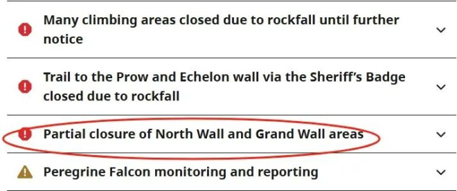 公园北墙地区的关闭影响到曼夸姆河森林服务道路 0 至 1.4 公里处的巨石区域。大墙巨石区的关闭范围包括从泰坦尼克号南侧到停机坪下山小径的区域。