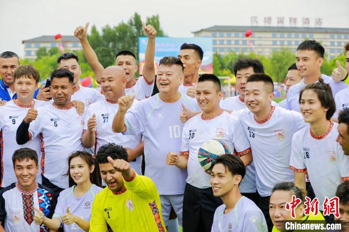 香港影视演员、精装明星足球队队长陈百祥与新疆新和县队员合影。新和县融媒体中心供图