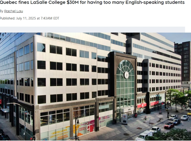 LaSalle College因在过去两年招收了过多的英语而被Legault领导的CAQ政府开出了$3000万的天价罚单。今早,LaSalle学院证实了这一消息,称其被指控违反了《法语宪章》(Bill 101)及其修订版《第96号法案》。
