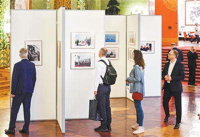 2025年4月18日,在俄罗斯首都莫斯科,嘉宾参观纪念中国人民抗日战争暨世界反法西斯战争胜利80周年图片展。 新华社记者 曹 阳摄