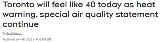 加拿大环境部表示,多伦多市民在周三将继续面临空气质量下降和极端高温,今天下午的体感温度将达到40度。