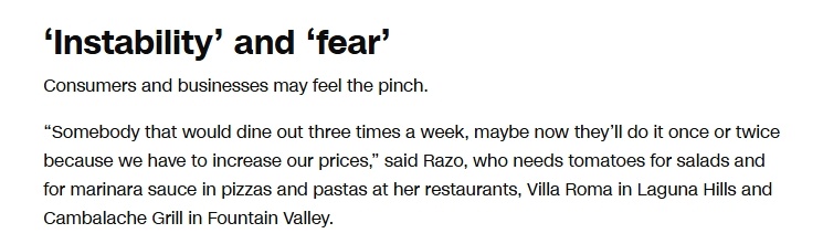 特雷莎·拉佐在美国加利福尼亚州经营着两家阿根廷-意大利风味餐厅,每天都需要用番茄制作沙拉以及用在披萨和意大利面里的番茄酱。她表示,如果关税导致番茄价格飙升,她的生意可能三个月后就会破产。
