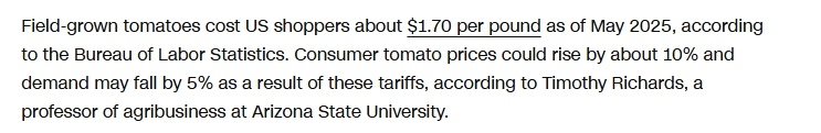 美国劳工统计局的数据显示,截至今年5月,田间种植的西红柿在美国每磅售价约为1.7美元(约合每公斤26.8元人民币)。亚利桑那州立大学教授蒂莫西 理查兹表示,征收关税后,美国番茄价格可能上涨10%左右,而需求可能下降5%。