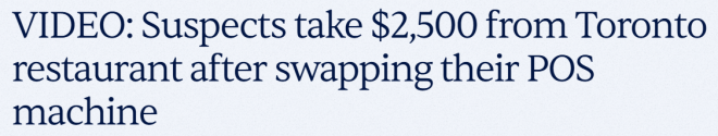 据Now Toronto报道,多伦多一家餐厅近日发现有两名男子调包了他们的销售终端(POS)机,店主现正提醒其他本地商户警惕这种新型手法。