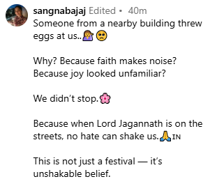 她还补充说:“我们没有停止游行。因为当主神贾甘纳塔(Lord Jagannath)走上街头时,任何仇恨都动摇不了我们。”
