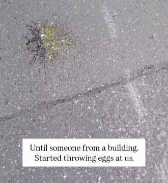 她在视频中展示了碎裂的鸡蛋洒在地上的画面,起码超过5个。Bajaj说,这些鸡蛋是从附近一栋建筑楼里被扔出来的。如果有人是想通过这种方式来阻止游行,那显然失败了。