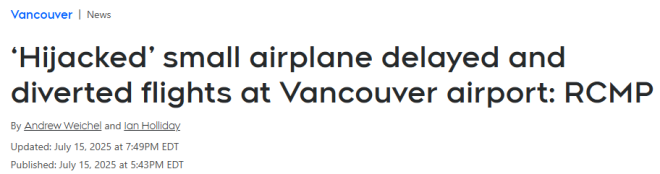 据CTV新闻7月15日报道,一名嫌疑人涉嫌劫持温哥华岛一架小型客机,并于周二下午扰乱了卑诗省最大机场的航空交通,目前已被逮捕。