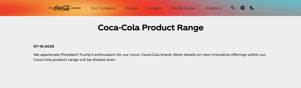 然而,与特朗普的言之凿凿相比,可口可乐公司的表态有所保留。该公司在官网上发布声明说:“我们感谢特朗普总统对我们标志性可口可乐品牌的热衷。我们将很快分享更多关于可口可乐产品系列中创新产品的详细信息。”