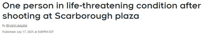 周四晚间,多伦多士嘉堡一处商场广场发生枪击事件,导致一人伤势危及生命。