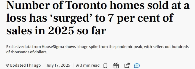 数据显示,截至2025年目前为止,多伦多大约有397套房产亏本出售,占今年已售房屋总数的约7%。