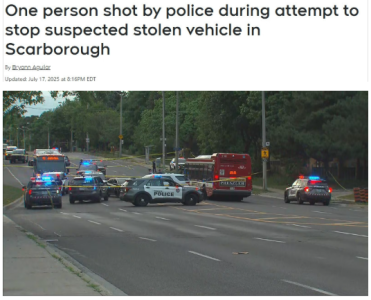 約克區警方表示,一名男子在士嘉堡疑似駕駛一輛被盜車輛時,遭警員開槍擊中。