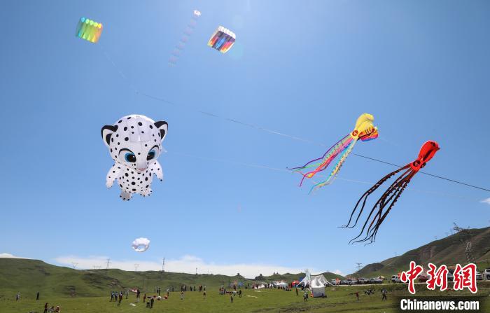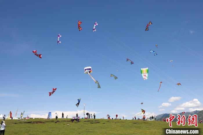 图为各类风筝飘舞在青海日月山的蓝天绿草间。 马铭言 摄