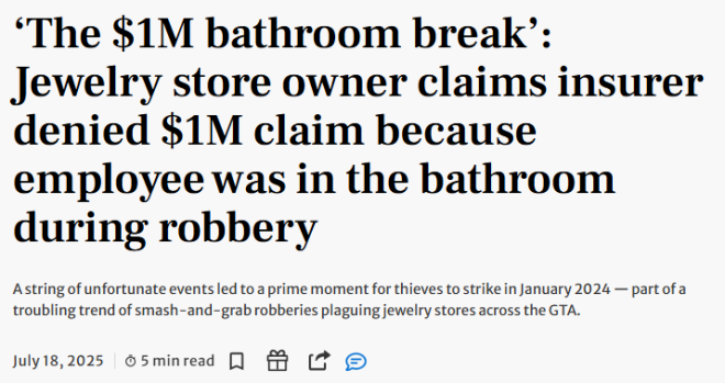 近日,一起令人瞠目的理赔纠纷引发热议:密西沙加一家珠宝店在遭遇暴力抢劫、损失超过130万加元后,保险公司却以“员工去上厕所”为由,拒绝赔付!