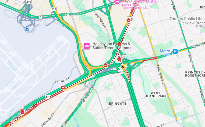 Fatal collision: EB /Dixon Rd. EB Hwy401 closed at the transfer lanes approaching Hwy427. There is no access to EB 401 from NB 427.