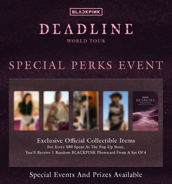 据Yorkdale购物中心发布的海报显示,这次的快闪店会有特别福利,店内每消费满$80加元,就可以获赠随机BLACKPINK照片卡1张。该卡片一套共4张。