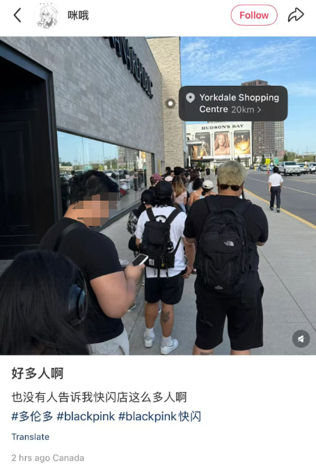 不少华人也在队伍其中。据小红书网友@咪哦表示,她完全没想到会有这么多人来排队BLACKPINK快闪店。她是在早上8点多来排队的。