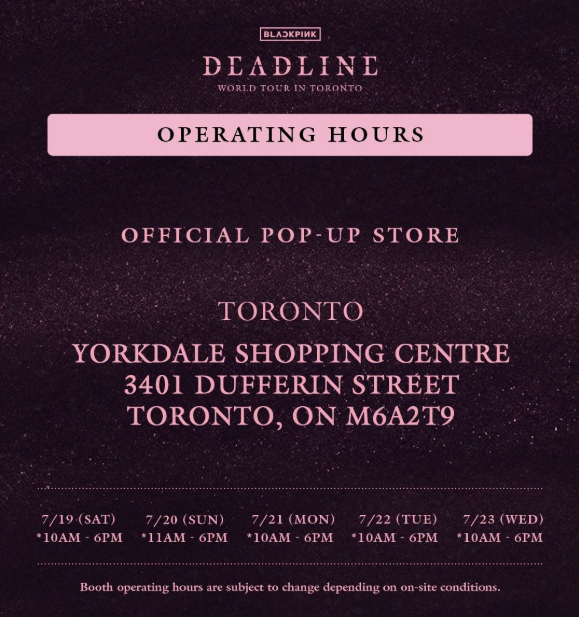 据多伦多Yordakle购物中心官方近日透露,BLACKPINK的官方快闪店将于7月19日-23日,在其商场内与大家见面,位置在KOTN服装店的旁边,Fox Home家具用品店的对面。该快闪店出售BLACKPINK的特别周边。