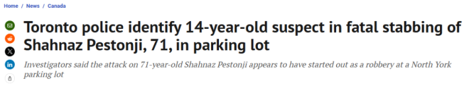 多伦多警方周五(7月18日)表示,一名14岁男孩涉嫌在一处停车场刺死一名老妇人,当时她刚逛完超市,正在将杂货装进车里。