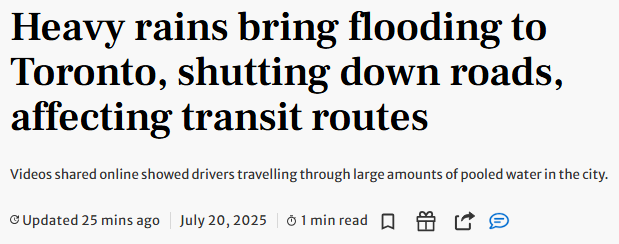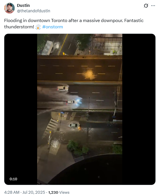 周六晚上至周日早晨,一场强雷暴突袭多伦多,导致全市多处严重积水、道路封闭、服务受阻。