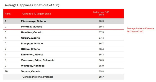 在加拿大十大城市中,只有密西沙加(70.3)和蒙特利尔(69.4)的幸福指数超过了全国平均水平(68.7)。