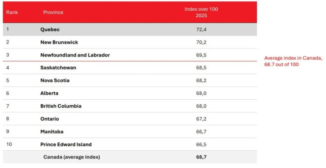 在加拿大最幸福省份排名中,BC省的表现略好一些,以 68 的指数位列第七。相比之下,魁北克省以 72.4 分的得分成为最幸福的省份。