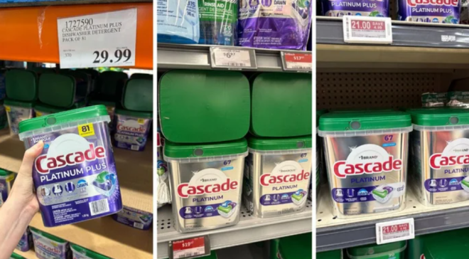 Costco:一袋含81个的Cascade Platinum Plus洗碗凝珠(1.25 公斤)售价$29.99,每100克约 $2.39,每颗约$0.37
