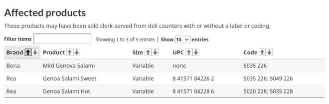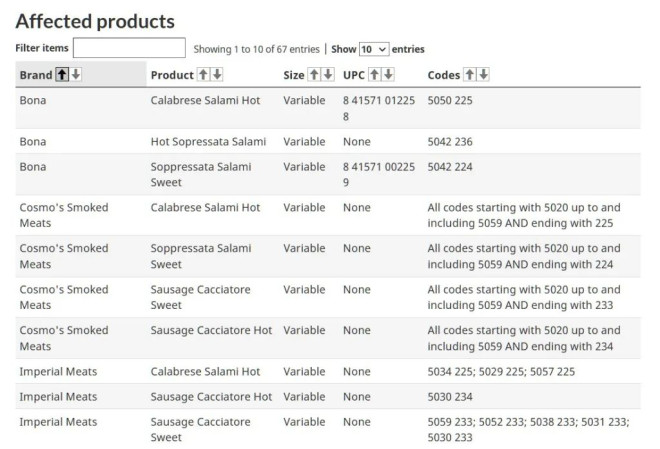 加拿大食品检验局已召回与此次疫情有关的 65 多种产品,包括 Rea 品牌萨拉米香肠、Bona 品牌萨拉米香肠、Cosmo’s Smoked Meats、Imperial Meats 以及其他在杂货店、专卖店、餐馆、咖啡馆、熟食店和肉店出售的品牌。