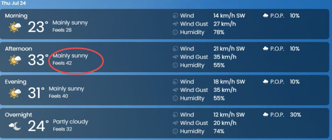 天气网络预计,周四白天最高33°C,体感可达42°C。