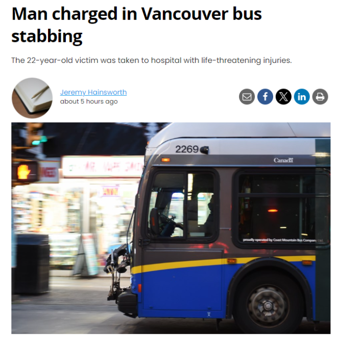 这起悲剧并非温哥华近月内的首宗类似事件。就在同一个周末,7月20日凌晨,一名22岁的男子在Kitsilano一辆公交车上被刺伤,伤势严重、生命垂危。警方表示,事发时间为凌晨3点前不久,地点在靠近Burrard大桥的区域。受害者被紧急送往医院抢救,嫌疑人随后在Burrard街与Cornwall大道附近被捕。