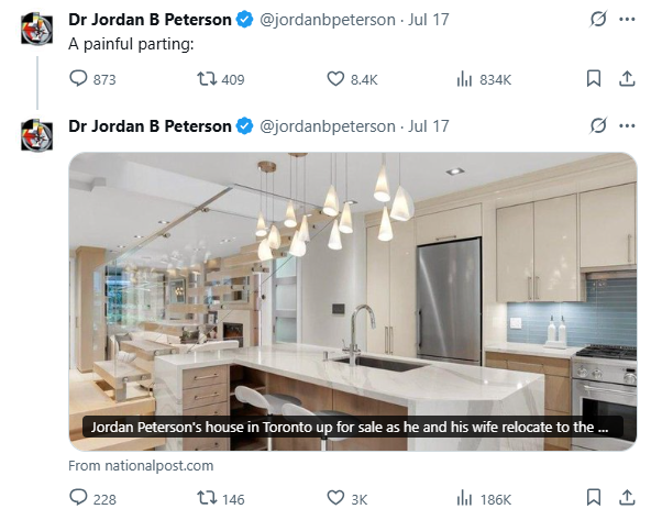最近,又有一位加拿大名人要离开加拿大。具有全球影响力的加拿大心理学家、作家、多伦多大学心理学教授——乔丹·彼得森(Jordan Peterson),正在挂牌出售其位于多伦多的房产,打算携妻子搬去美国亚利桑那州。