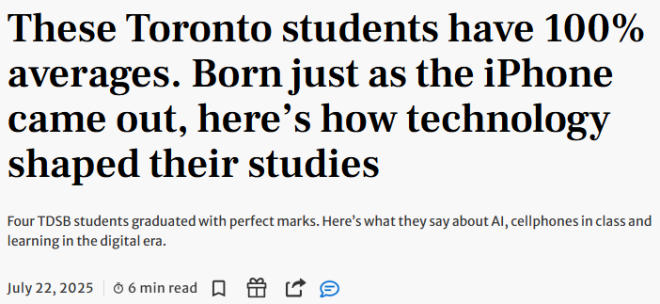 在触摸屏、话题标签与无尽的滑动浏览中长大,他们的生活见证了社交媒体的崛起,也赶上了ChatGPT等生成式AI的出现。《多伦多星报》采访了这四位“数码原住民”顶尖学霸,了解他们依赖哪些科技工具、如何保持专注的习惯、以及他们如何看待新出台的“安省教室手机禁令”。