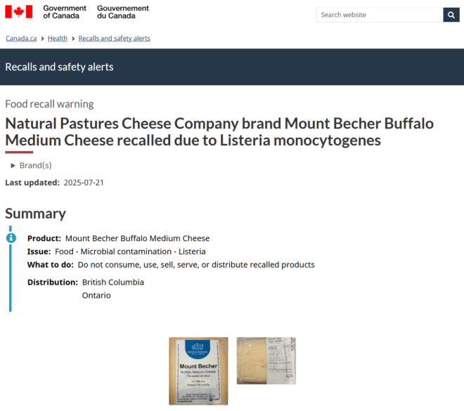 召回原因:可能受到李斯特菌(Listeria monocytogenes)污染,存在严重健康风险。请勿食用、使用、销售、提供或分发该产品。检查家中是否有该产品,如有请丢弃或退回购买处。如曾食用且感到不适,请联系医疗机构。