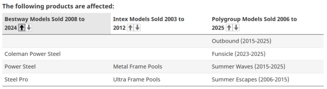 召回涉及的泳池为高度48英寸(122厘米)或以上的特定型号,这些产品于2002年1月至2024年5月期间在加拿大销售。召回范围包括以下型号和销售年份: